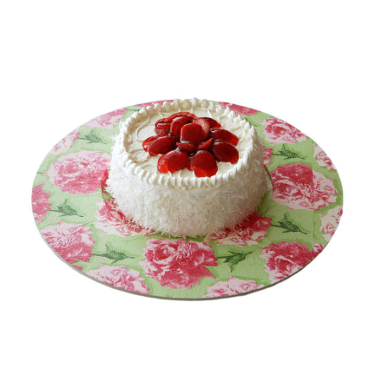 Pão de ló branco, creme belga e morangos com cobertura de creme bombonata e flocos de coco.